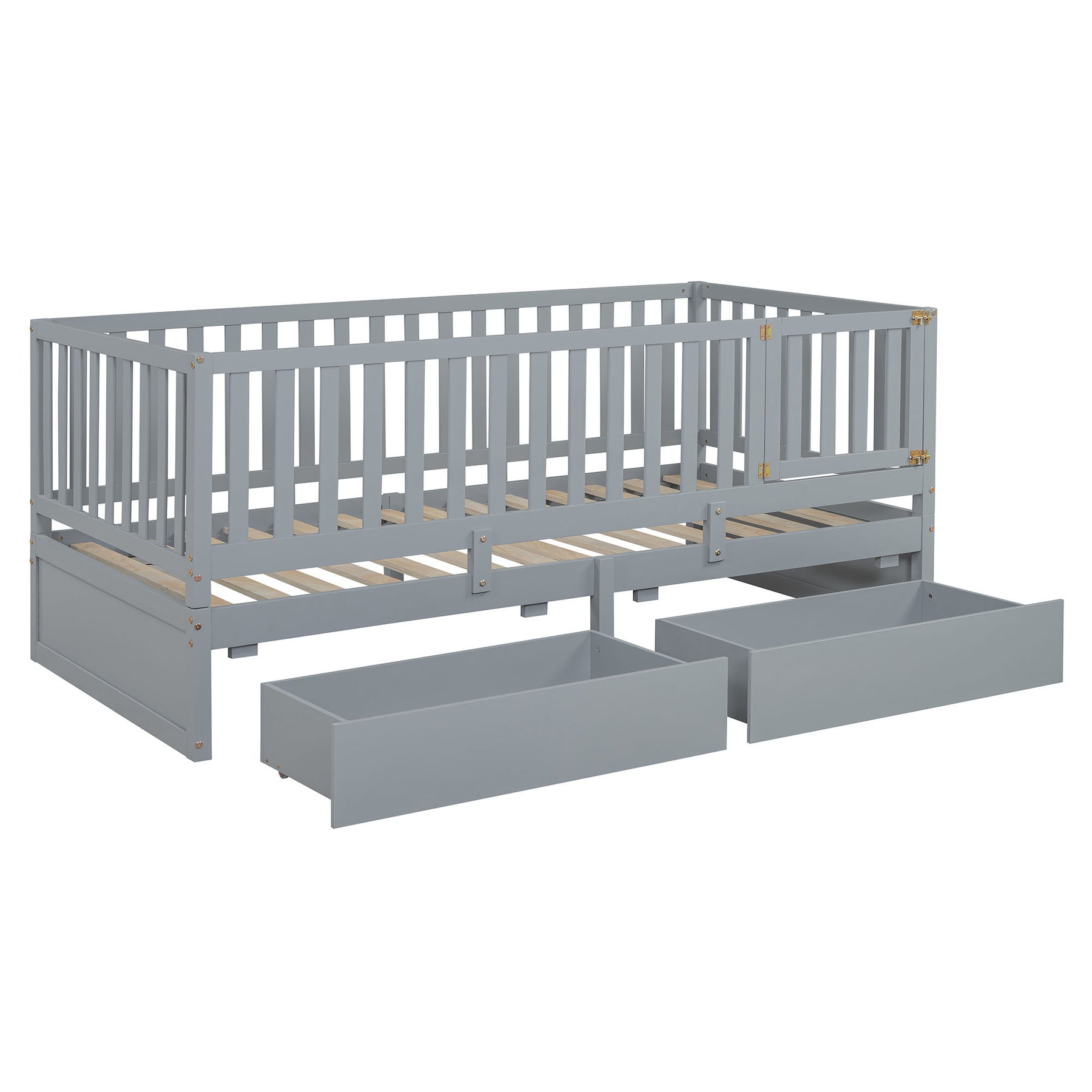 Twin Size Daybed With Fence Guardrails And 2 Drawers, Split Into Independent Floor Bed & Daybed - Gray