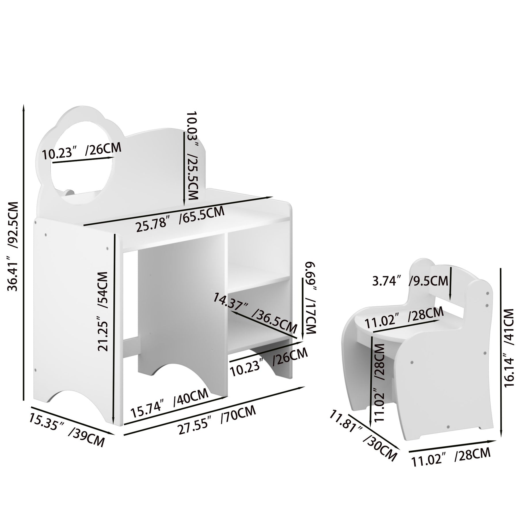 Kids Vanity Table With Mirror And Chair, Dressing Makeup Desk With Storage Shelves - White