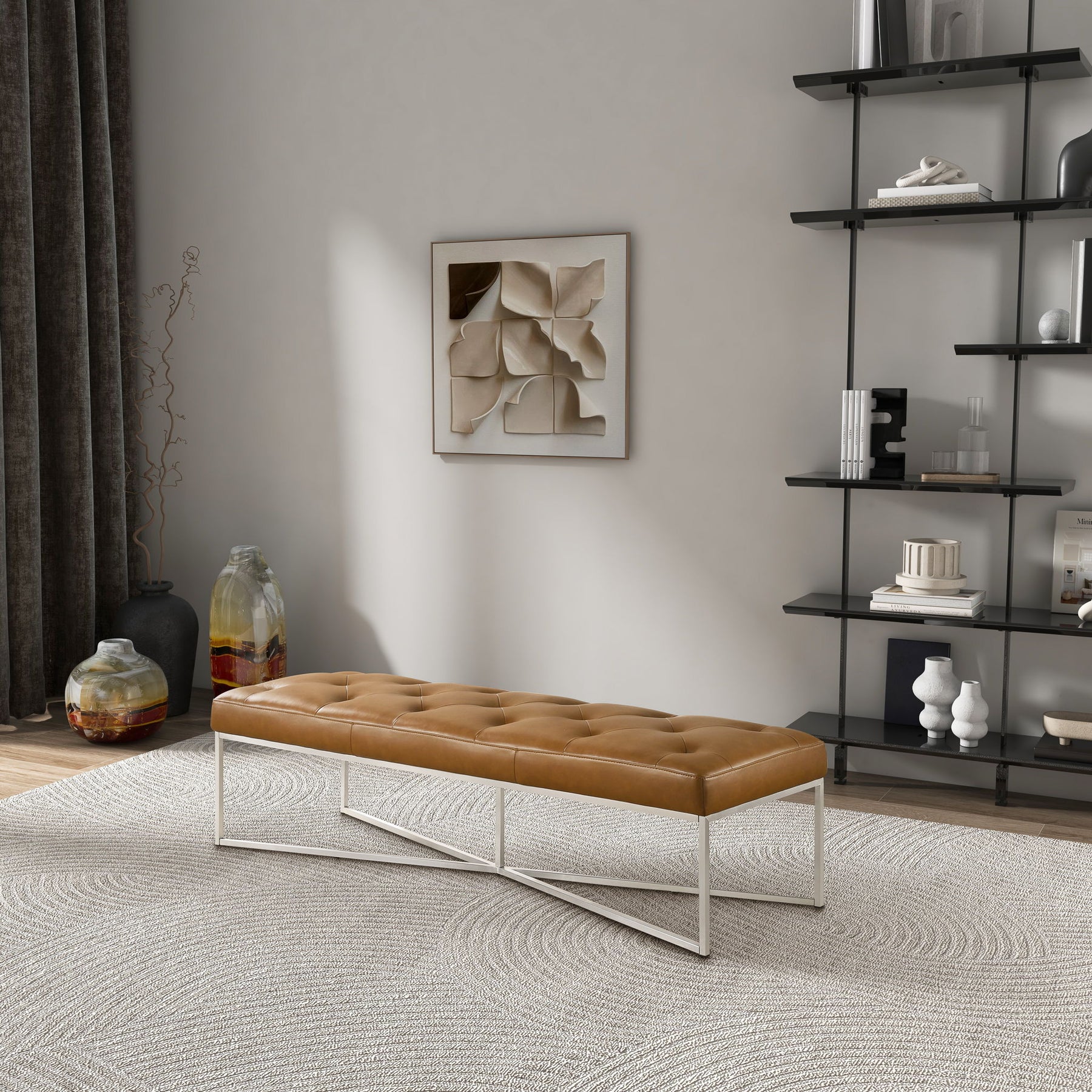 - Premium Upholstery: The Harper Tan Leather Bench is upholstered in full grain leather with buttons, offering a luxurious and sophisticated appearance.