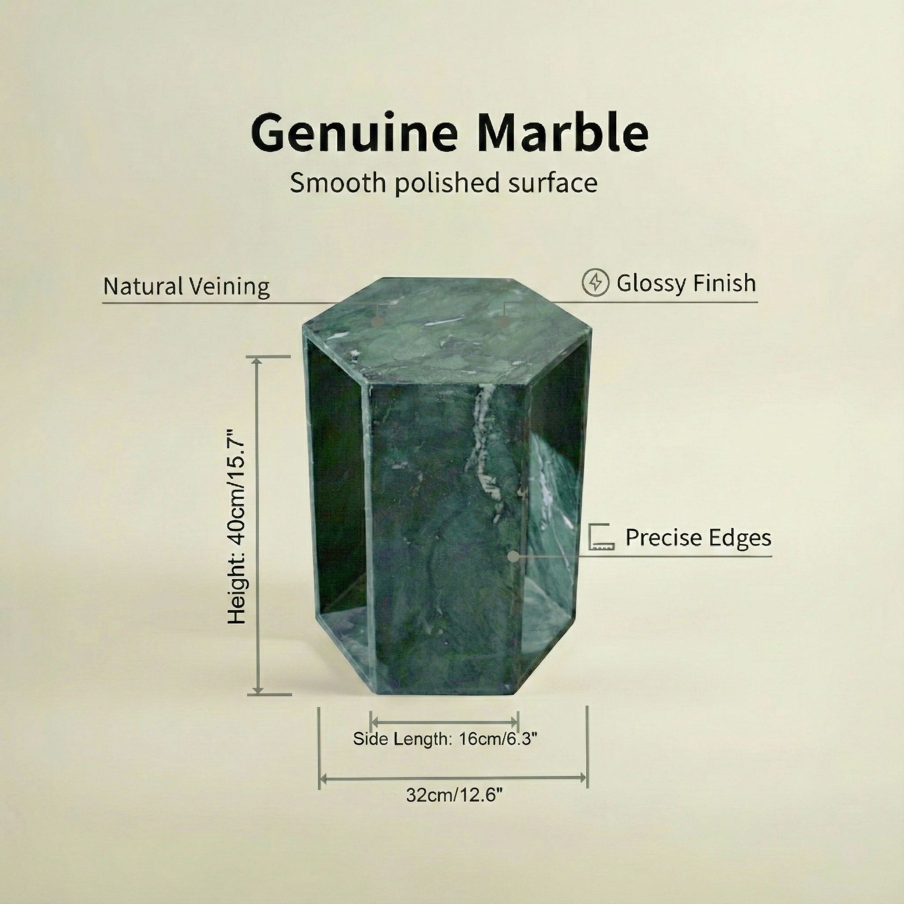 Hexagon Side Table Geometric Stone With Veining Polished Pedestal Nightstand For Living Room - Green