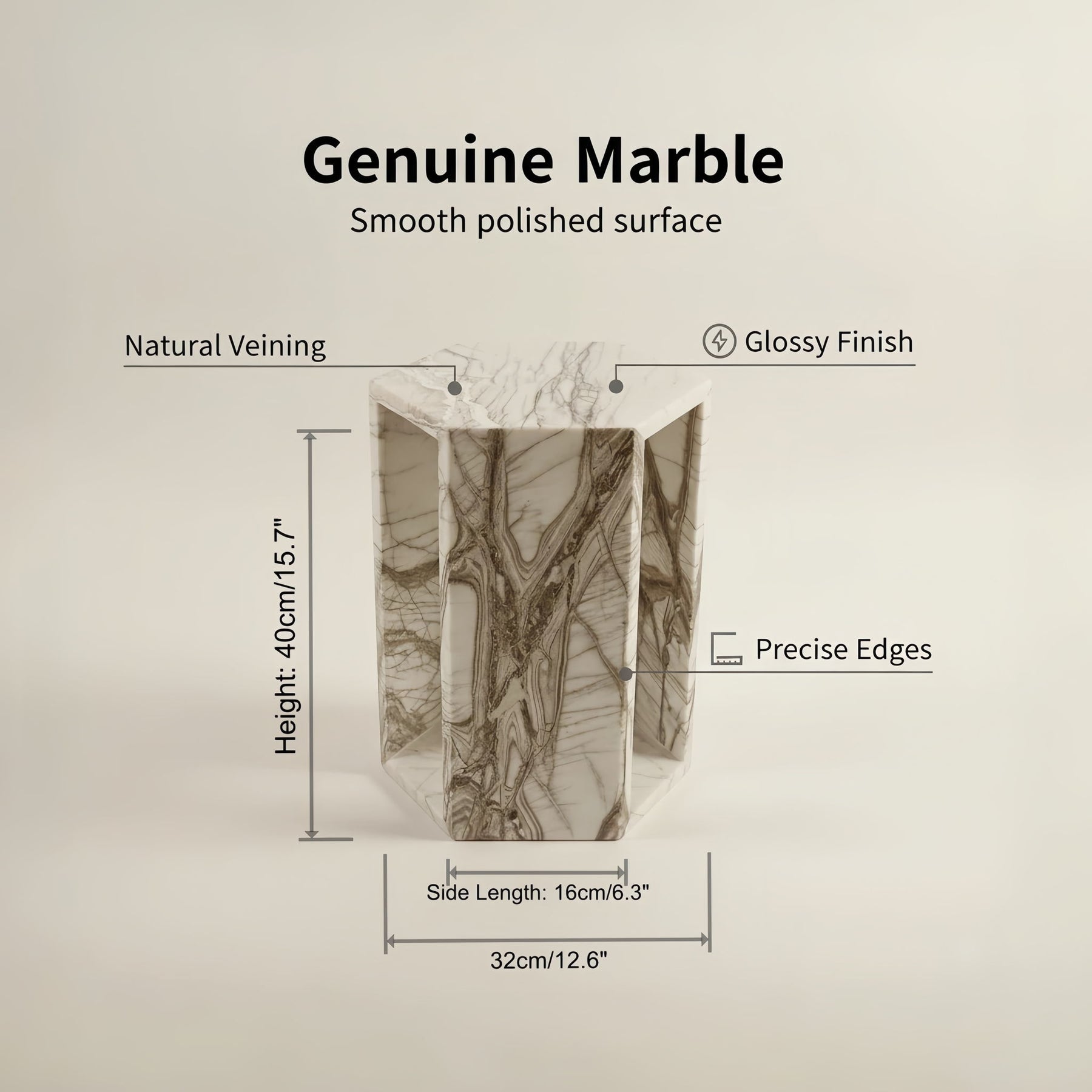Hexagon Side Table Geometric Stone With Veining Polished Pedestal Nightstand For Living Room - White / Multi