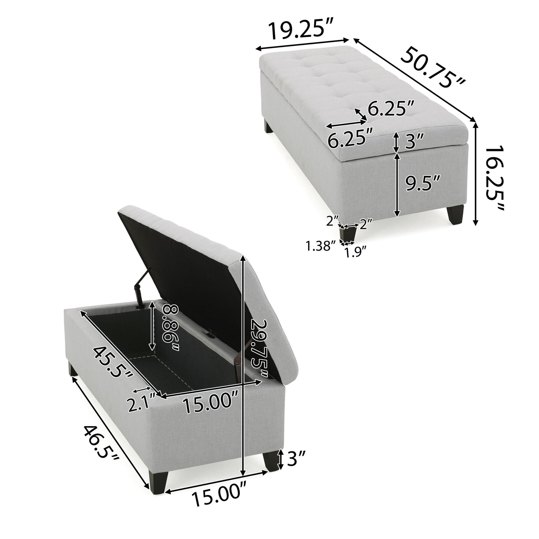 Home Mission - Upholstered Storage Ottoman Bench - Light Gray
