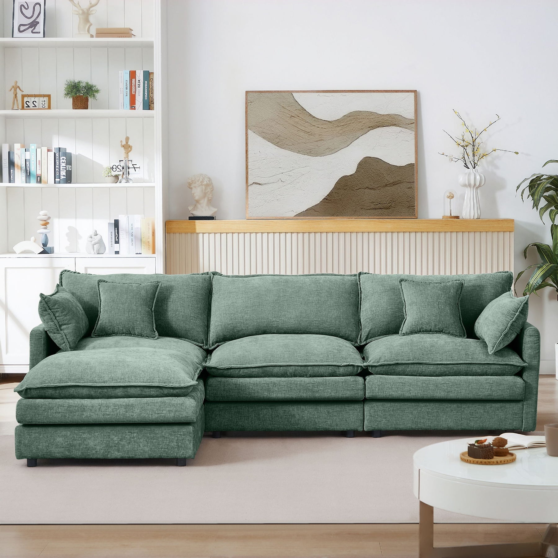 Modular L-Shaped Sectional Sofa, 3 Seater Cloud Couch & Movable Ottoman - Green