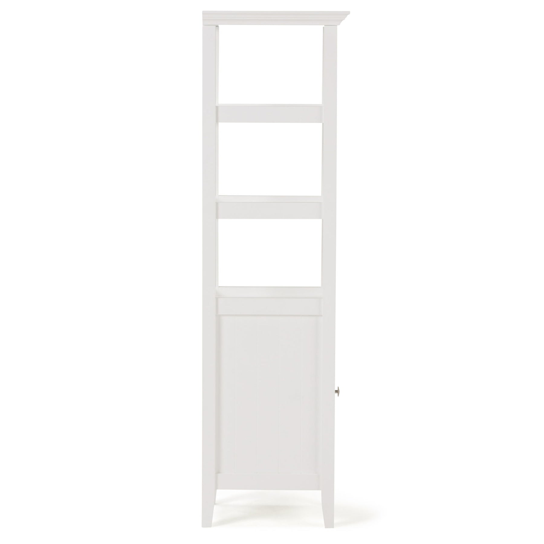 • Features one (1) door with one (1) adjustable interior shelf and three (3) open shelves. Brushed nickel hardware