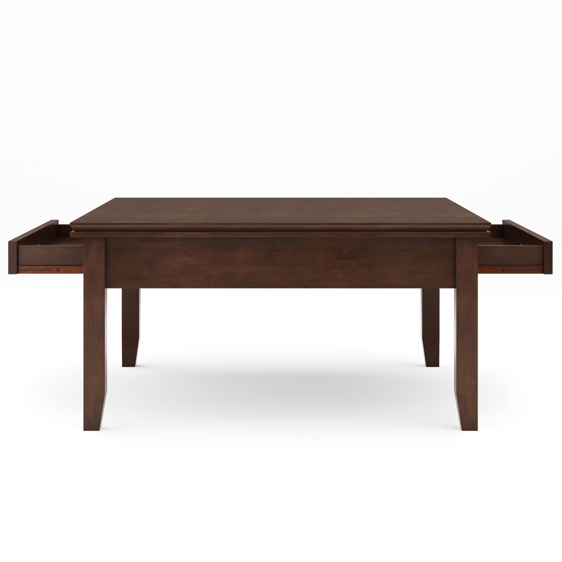- Transitional design includes clean angle edged table top, square, slightly tapered legs and rectangular Antique Bronze knobs