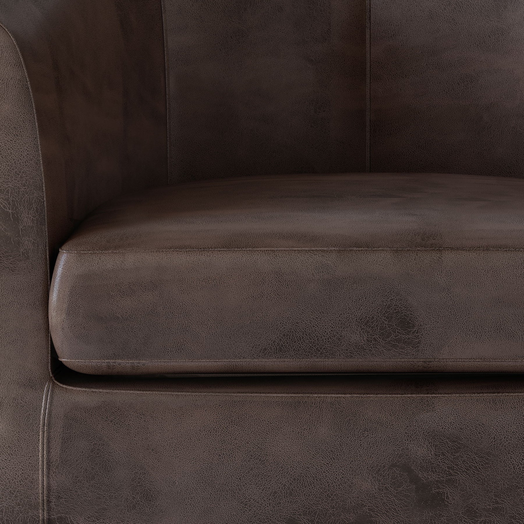- Features curved back, sides with top stitching detail, dark brown solid wood legs and removable high density foam seat cushion