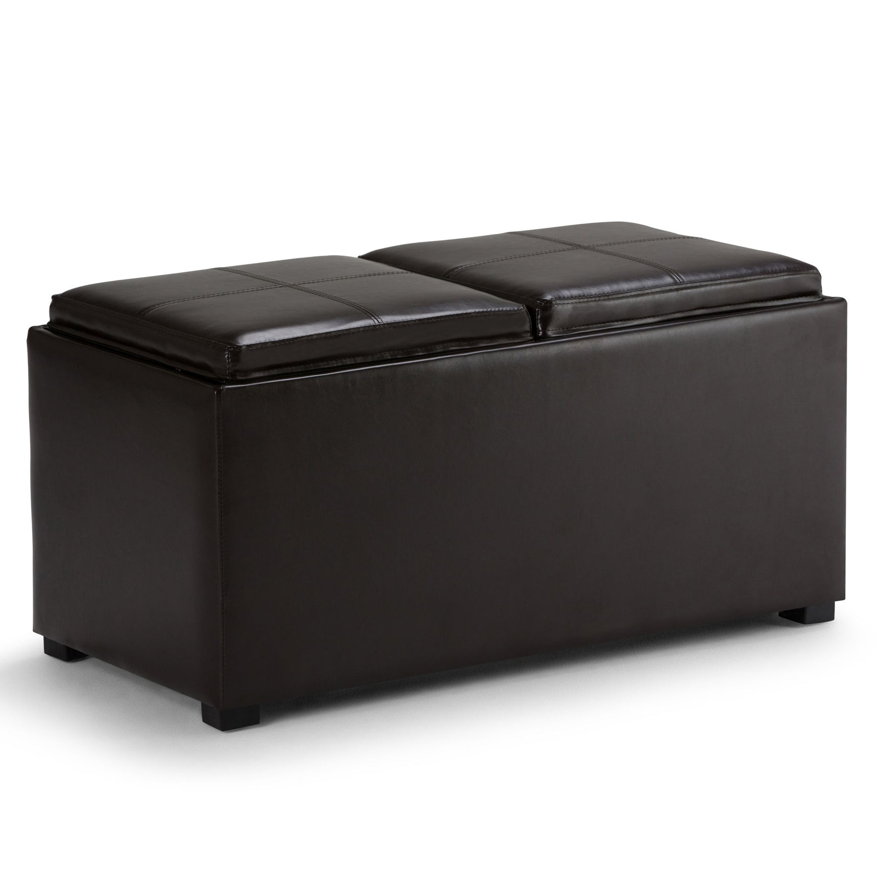 - Features a 5 piece ottoman set with 1 large rectangular ottoman and 2 smaller ottomans, large interior storage space, two flip over serving trays