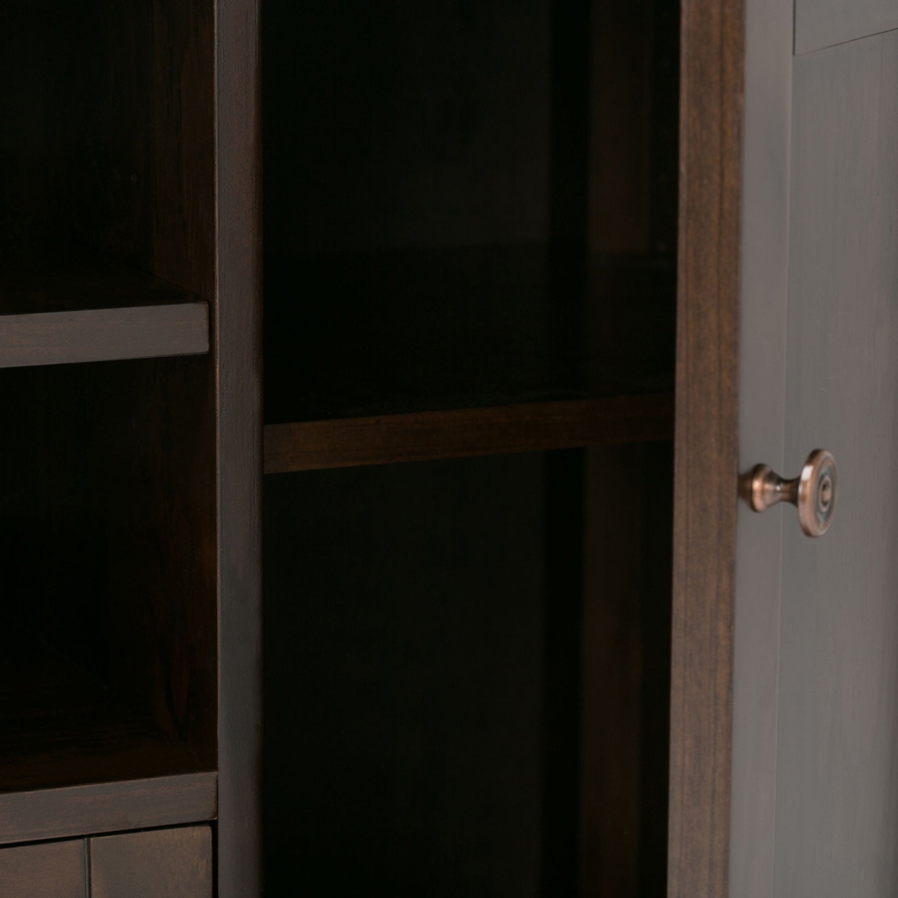- Features two (2) central doors for cubby storage, open center area with adjustable shelf and two (2) side doors that open to large storage spaces with two (2) shelves each