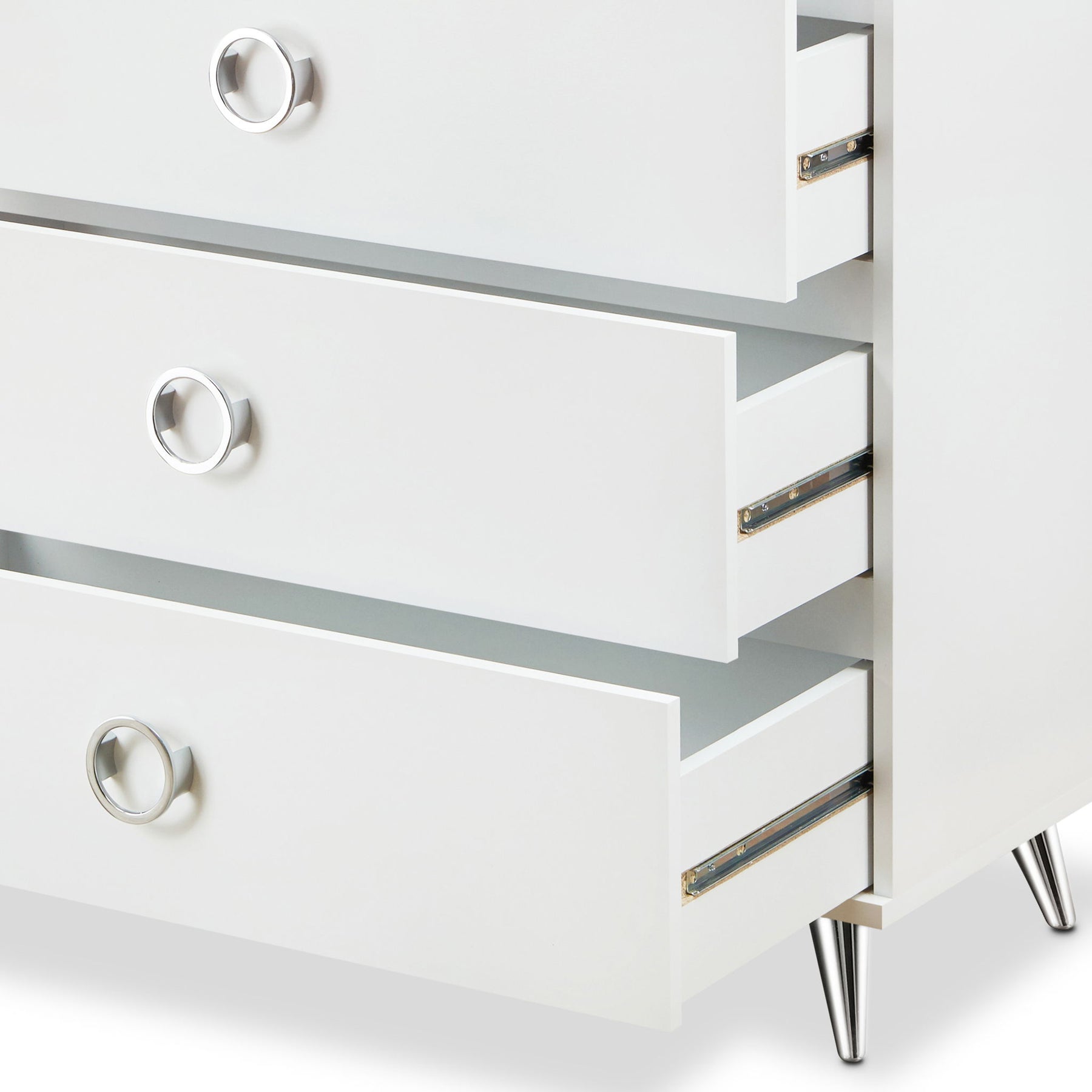 - Refined Aesthetic: The drawers are accented with single ring pull hardware in silver, enhancing the chest's refined aesthetic while maintaining practicality and easy access.