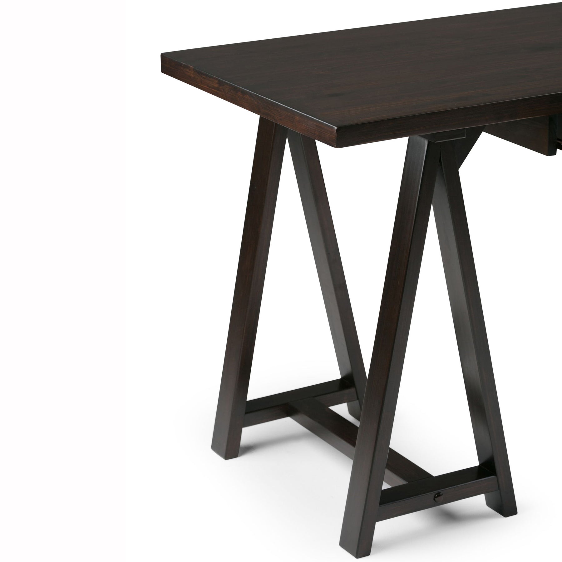 - Features a simple and wide, extra thick table top surface, integrated wood keyboard tray and sturdy sawhorse supports