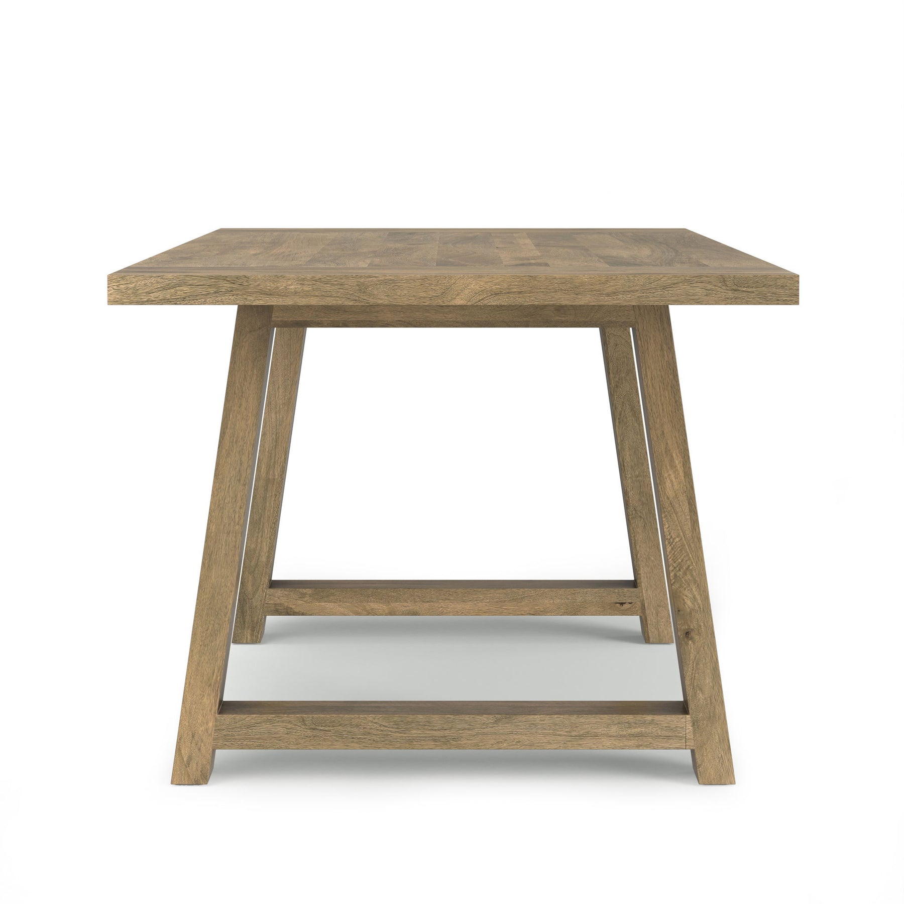 - The thick, rectangular tabletop is made with sustainably sourced solid mango wood in a Grey Wash finish and perpendicular panels on the short sides for visual contrast.